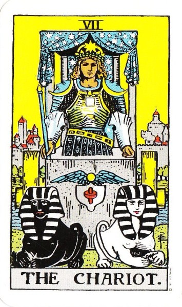 This card is shown fairly similar across the different decks, sometimes the sphinxes are replaced by other animals like horses or dragons. Mostly the two animals at the front are two opposite colours, indicating the duality - the two sides of decision making before we can follow our plans. It also shows our need to control the situation if we want to get ahead.