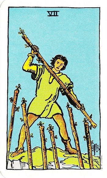 The Crowley Tarot has a more positive spin on Seven of Wands, calling it courage. It shows one different Wand and six similar ones. This one wand dares to be different and stand out.